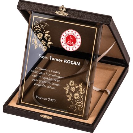 Adalet Bakanlığı Tebrik Plaketi – Altın Yaldız Kristal (15×20 cm, 8mm Kalınlık) Adaletin sembolü olan bu özel plaket, Adalet Bakanlığı